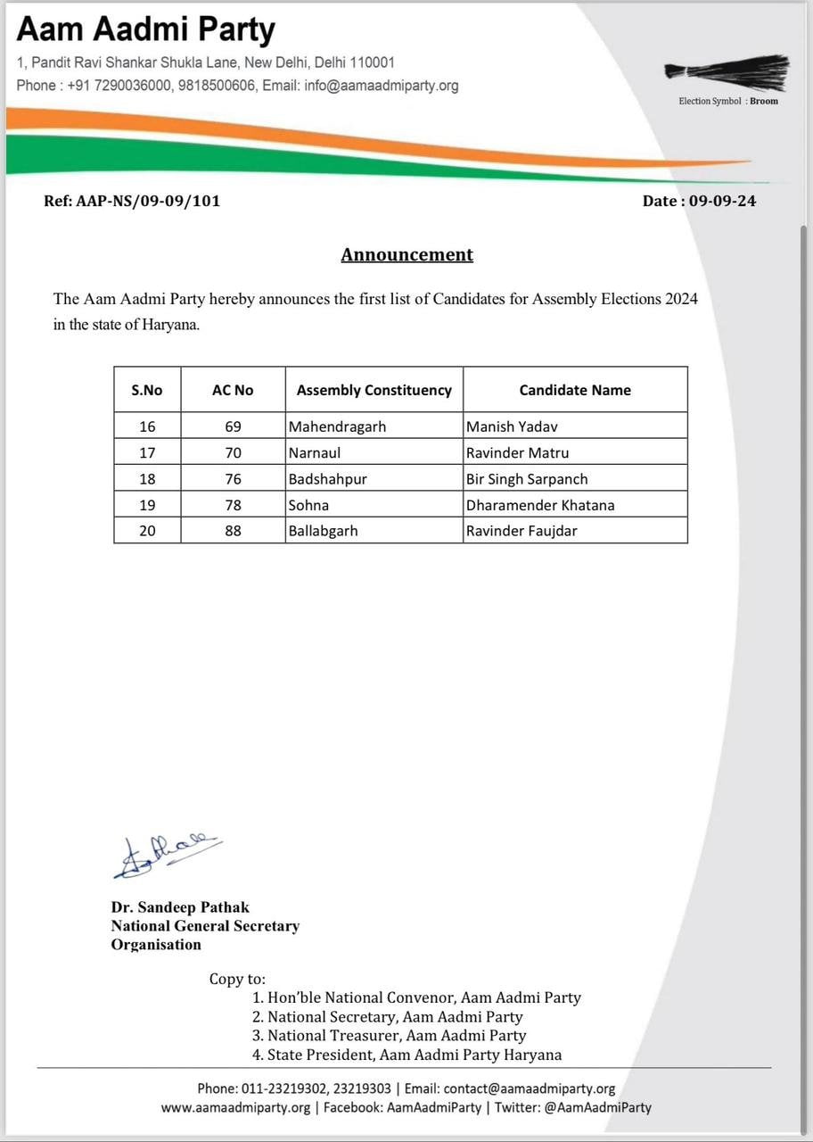 The Party hereby announces the following candidates for the state elections for Haryana Assembly.